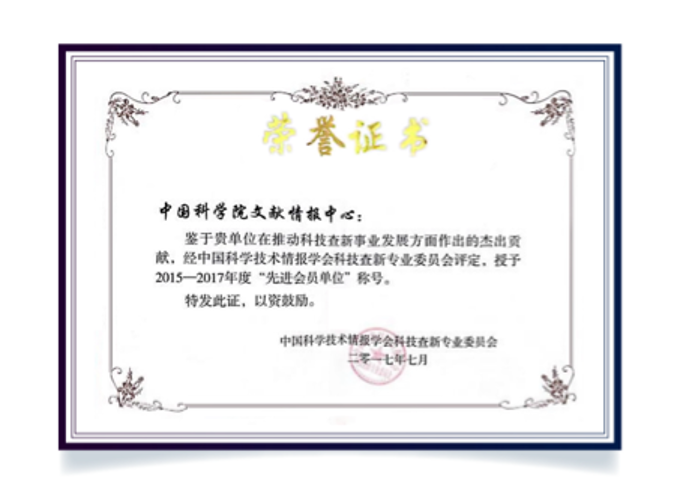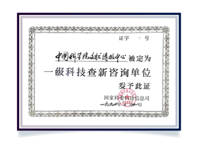 中国科学院文献情报中心1994年被原国家科委批准为一级科技查新咨询单位,为中国科学技术情报学会科技查新专业委员会的“先进会员单位”。